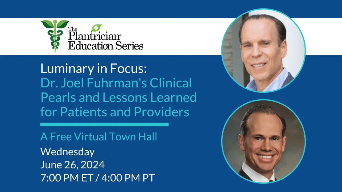 Join us for an exciting interactive conversation with Dr. Joel Fuhrman, our 2024 Plantrician Project Luminary Award recipient. In this special Plantrician Education Series, Dr. Fuhrman will share some key “clinical pearls”, solutions to challenging cases, and critical insights from over 35 years of utilizing intensive lifestyle interventions and plant-based nutrition in his practice to suspend and even reverse disease. Bring your questions for Dr. Fuhrman and our host Dr. Scott Stoll, and join us for “Luminary in Focus: Dr. Joel Fuhrman’s Clinical Pearls and Lessons Learned for Patients and Providers” on Wednesday, June 26 at 7pm ET / 4pm PT.